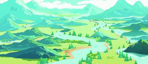 于是,劉岳峰和康輝找設(shè)計師畫了一幅中國風(fēng)的三江源“山水畫”,通過它來描述催化劑作用原理。釕基催化劑就是一座座高山,“氫溢流”就是山腰上蜿蜒而下的河流,暢通無阻的河道中流淌的是氫,河道旁的平原就是氧化鈦-氧化錳,在河流灌溉下長出樹木,氫氣成為養(yǎng)分,一氧化碳就是果實。