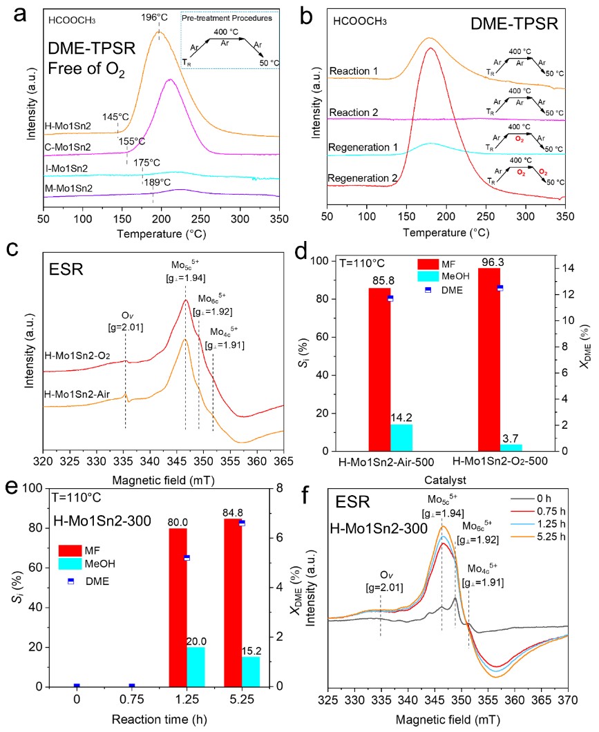 研究團隊采用水熱法構筑了具有豐富Mo5+物種的Mo-Sn催化劑(H-Mo1Sn2)。與傳統的共沉淀法、浸漬法、機械混合法相比,水熱制備的H-Mo1Sn2上無定形MoOx物種高度分散在SnO2表面,實現了在110 下二甲醚低溫氧化高選擇性制備甲酸甲酯,比已有報道的反應溫度降低了50 (圖1)。
