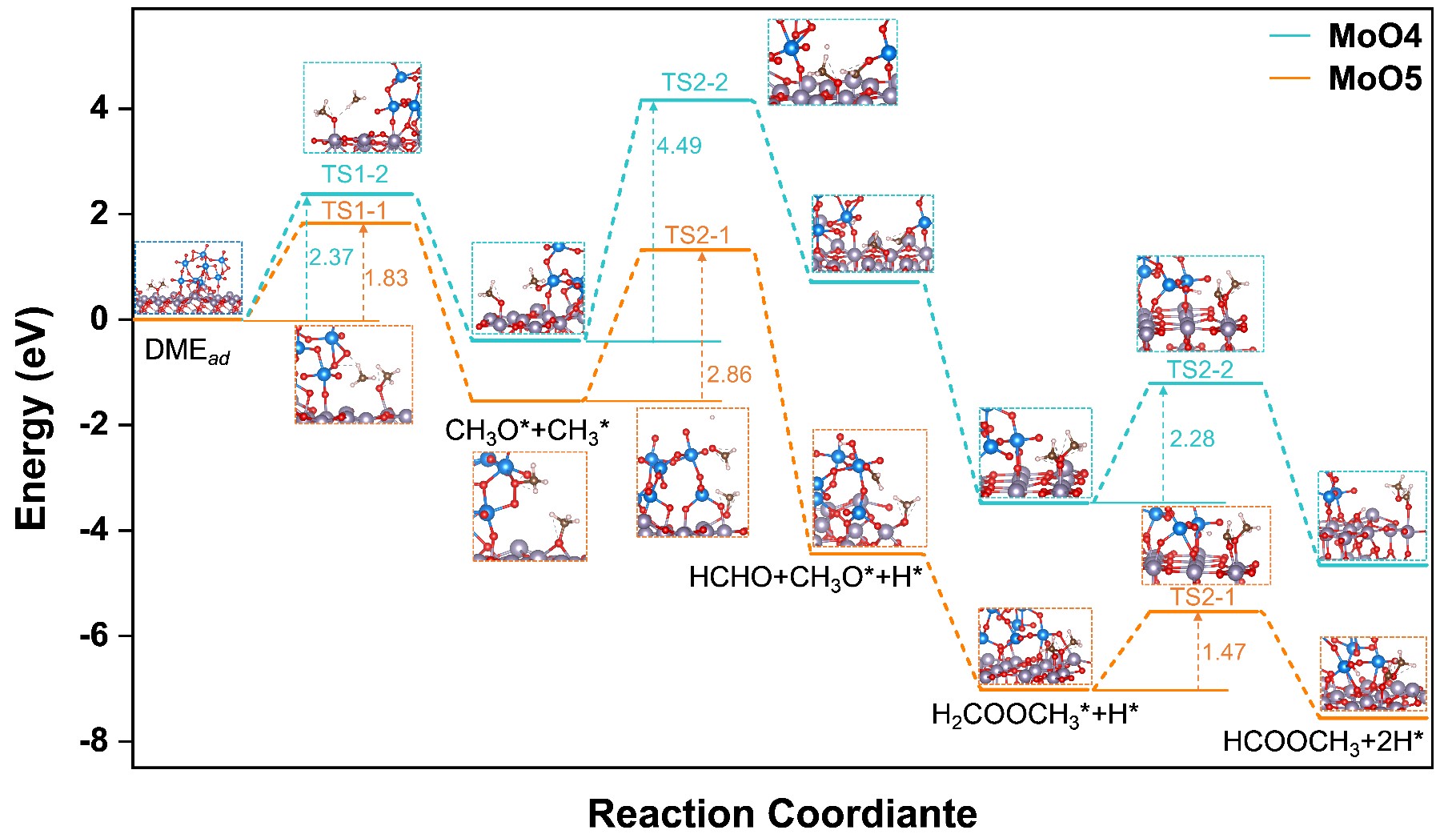 結合多種表征技術、原位實驗和理論計算,揭示了不飽和五配位五價鉬Mo5c5+是低溫氧化活性中心,該結構在CH3O*中間體中C-H的活化氧化決速步起到了關鍵作用(圖4)。