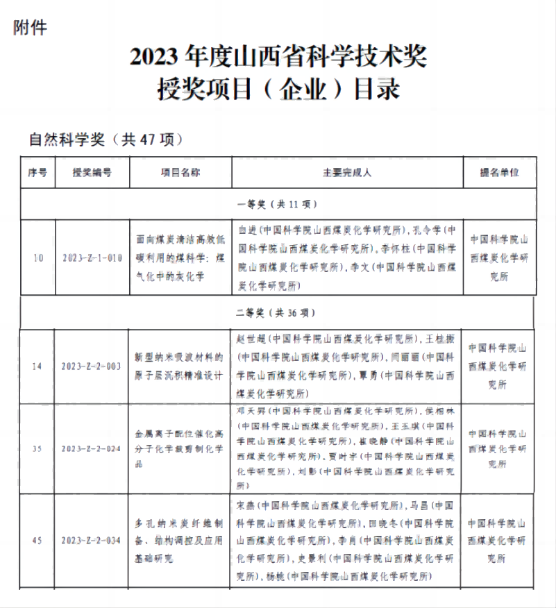 近日,山西省人民政府印發(fā)《關(guān)于2023年度山西省科學(xué)技術(shù)獎(jiǎng)勵(lì)的決定》(晉政函〔2024〕44號(hào))。山西煤化所1項(xiàng)研究成果榮獲山西省自然科學(xué)一等獎(jiǎng),3項(xiàng)研究成果榮獲山西省自然科學(xué)二等獎(jiǎng),科技獎(jiǎng)勵(lì)質(zhì)量實(shí)現(xiàn)了大幅提升。