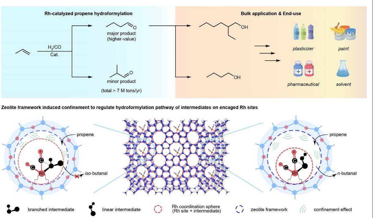 近日,中國科學(xué)院山西煤炭化學(xué)研究所曹直研究員團(tuán)隊(duì)與中科合成油技術(shù)股份有限公司團(tuán)隊(duì)在該研究方向取得了突破性進(jìn)展,利用多相“銠-分子篩”負(fù)載型催化體系,首次實(shí)現(xiàn)了丙烯氫甲酰化以超高區(qū)域選擇性制取出正丁醛。該團(tuán)隊(duì)將經(jīng)典的分子篩骨架對(duì)反應(yīng)中間體的“擇形效應(yīng)”拓展應(yīng)用至分子篩骨架與結(jié)構(gòu)清晰的銠活性位點(diǎn)之間形成的狹小限域空間,通過抑制在氫甲酰化反應(yīng)中生成具有較大空間位阻的異丁醛中間體,實(shí)現(xiàn)了對(duì)目標(biāo)產(chǎn)物正丁醛超過99%的區(qū)域選擇性,同時(shí)醛類產(chǎn)物總選擇性也高于99%,催化劑轉(zhuǎn)化頻率超過6500 h-1。上述催化性能結(jié)果超越了迄今為止報(bào)道的所有多相催化劑和幾乎所有的均相催化劑。該研究不僅為如何通過多相催化的方法選擇性獲取熱力學(xué)上更不穩(wěn)定的反馬式加成產(chǎn)物——正丁醛提供了一種新方法,也進(jìn)一步拓展了經(jīng)典分子篩骨架“擇形催化”這一概念,也為目前丙烯氫甲酰化工業(yè)生產(chǎn)中存在的巨大挑戰(zhàn)提供了新的解決思路與方法。