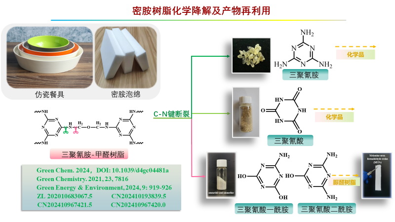 近日,山西煤化所煤炭高效低碳利用全國重點實驗室侯相林、鄧天昇團隊在廢棄密胺樹脂化學解聚制備高值化學品領域取得了突破性進展,設計了綠色高效的水相降解體系,首次實現了密胺樹脂催化降解為單體三聚氰胺的定向解聚(三聚氰胺產率高于95%,三聚氰胺純度為99.5%)。密胺樹脂在催化劑和水的協同作用下直接生成單體三聚氰胺,并且確定了密胺樹脂選擇性斷裂了sp3C-sp3N鍵,為探究密胺樹脂的化學降解路徑提供了直接證據(Green Chem. 2024,DOI: 10.1039/d4gc04481a,CN202410967420.0)。三聚氰胺是合成密胺樹脂的單體之一,具有非常廣泛的應用,但生產條件相對苛刻,合成密胺樹脂也是其主要的應用途徑之一。密胺樹脂化學解聚制備三聚氰胺,具有非常重要的意義,這不但是一種高效生產三聚氰胺的途徑,而且實現了密胺樹脂廢棄物的閉環回收。