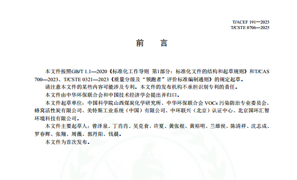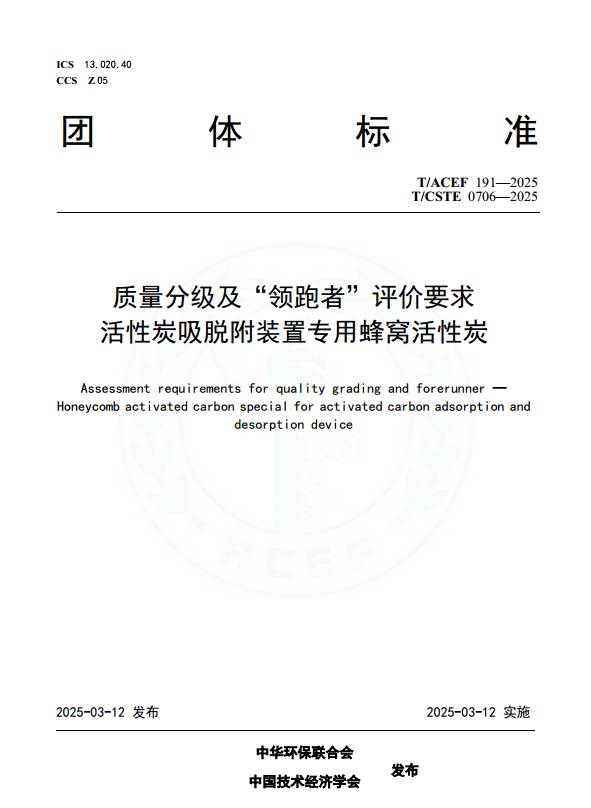 日前,由中華環(huán)保聯(lián)合會(huì)和中國技術(shù)經(jīng)濟(jì)學(xué)會(huì)提出并歸口,山西煤化所309課題組牽頭編制的《質(zhì)量分級(jí)及“領(lǐng)跑者”評(píng)價(jià)要求 活性炭吸脫附裝置專用蜂窩活性炭》(T/ACEF 191—2025、T/CSTE 0706—2025)團(tuán)體標(biāo)準(zhǔn)(簡稱“領(lǐng)跑者”評(píng)價(jià)標(biāo)準(zhǔn))正式在全國團(tuán)體標(biāo)準(zhǔn)信息平臺(tái)發(fā)布,并于2025年3月12日起開始實(shí)施。