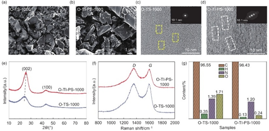 經(jīng)過(guò)1000℃炭化后,TS衍生的硬炭(O-TS-1000)展現(xiàn)出更大的層間距和更無(wú)序的碳層排列,為鈉離子提供了更多嵌入空間和快速通道。相比之下,TI-PS衍生的硬炭(O-TI-PS-1000)層間距較小,結(jié)構(gòu)更接近石墨,鈉離子嵌入困難,導(dǎo)致容量較低。