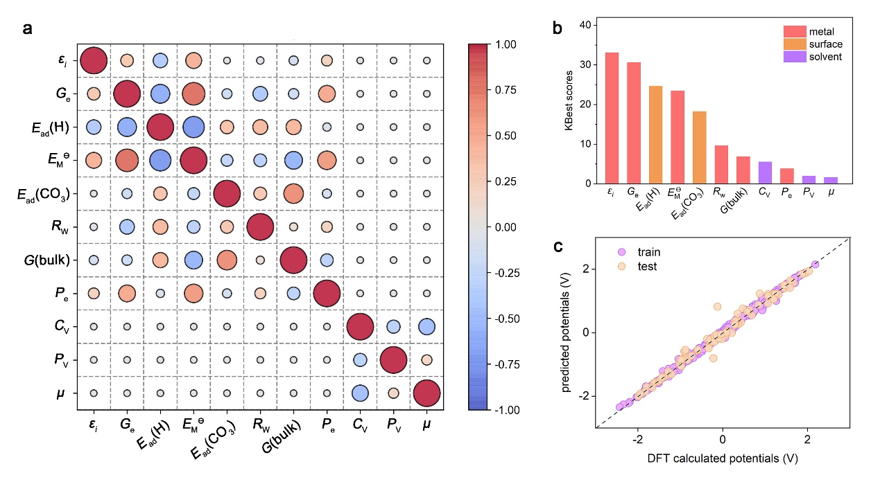 研究團隊采用前期開發的推廣CHE模型計算電解液還原分解電位,利用得到的12種常見電解液溶劑在32種金屬雜質原子和空位表面的384個還原電位數據構建反應電位數據庫。隨后通過特征工程保留了11個最佳特征,以還原電位數據庫劃分為訓練集和測試集,將隨機森林、支持向量機、梯度提升、XGboost等機器學習算法進行模型訓練和參數優化,發現基于XGboost算法的機器學習模型具有最高的預測精度和最低的過擬合程度。進而采用SHAP算法對模型進行可解釋性分析,發現電解液溶劑的熱容、蒸氣壓和偶極矩等性質對還原電位有較大影響。
