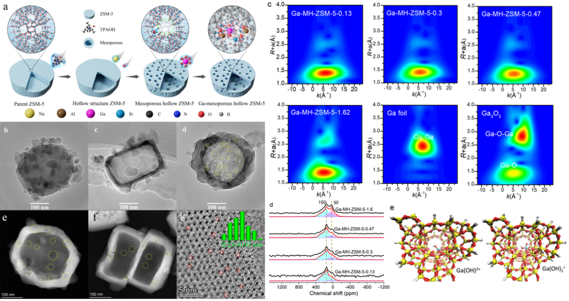 團隊研制了具有微孔-介孔-大孔結構的ZSM-5分子篩,通過控制合成條件,有效調控了負載Ga物種的結構和狀態。TEM結果表明通過重結晶、堿處理等手段成功合成了具有微孔-介孔-大孔結構的ZSM-5分子篩。iDPC-STEM結果證明Ga物種主要以單原子結構存在(平均粒徑為0.23 nm)。同步輻射與固體核磁結果表明,Ga負載量小于0.47%時,以四配位Ga物種為主;負載量高于0.7%時,出現六配位Ga物種。Ga含量與ZSM-5分子篩B酸位點的交換度表明,當Ga負載量小于0.3%時,主要以[Ga(OH)]2+物種為主;隨著Ga負載的增加,開始形成較多的[Ga(OH)2]+物種和GaOx團簇。