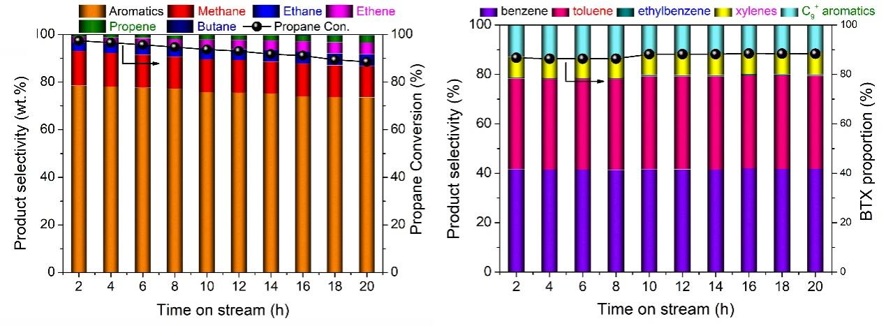 Ga-MH-ZSM-5催化劑在丙烷芳構化反應中表現出優異的性能。丙烷轉化率和芳烴選擇性分別高達97.4%和78.2wt%,其中,輕質芳烴(BTX)占比高達88%。