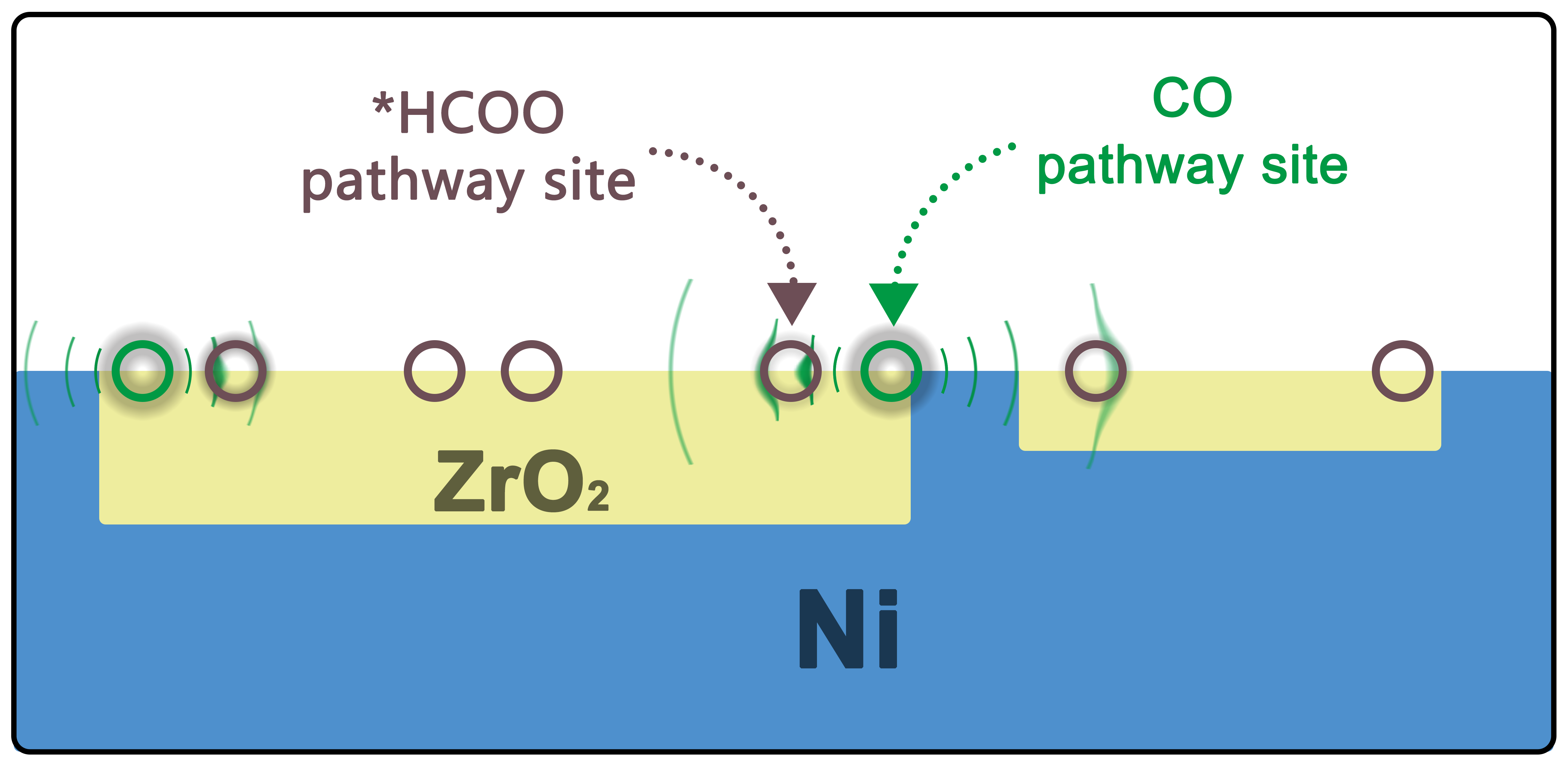 在本研究中,團隊構建了均勻分布的反相ZrO2/Ni催化劑并對制備工藝進行了優化,通過調整Zr和Ni的比例,實現了金屬-氧化物相互作用的調控,提高了催化劑的低溫活性。催化劑在持續和循環穩定性實驗中都體現出了良好的反應性能。與純鎳和傳統催化劑的比較分析結果表明,反相催化劑之所以具有更好的低溫活性,是因為Ni作為基礎提供了強的解離H2的能力,并通過氫溢流效應還原了部分ZrO2,進而產生大量氧空位作為CO2的吸附和活化位點。反應過程中CO路徑和HCOO鹽路徑同時存在,并且互相協同。催化劑高的穩定性則得益于催化劑簡單、均勻且穩定的構造。