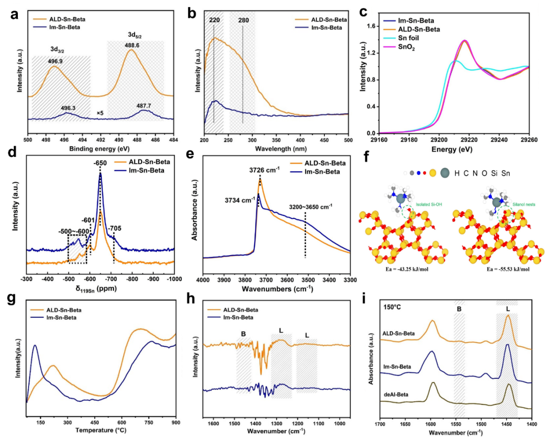 圖1.(a)催化劑的XPS譜圖,(b)UV-Vis譜圖,(c)XANES譜圖,(d)119Sn MAS NMR譜圖,(e)DRIFTS譜圖,(f)TDMASn在表面Si-OH基團和羥基巢的理論吸附能,(g)NH3-TPD譜圖(h)NH3-FTIR譜圖和(i)Py-IR譜圖