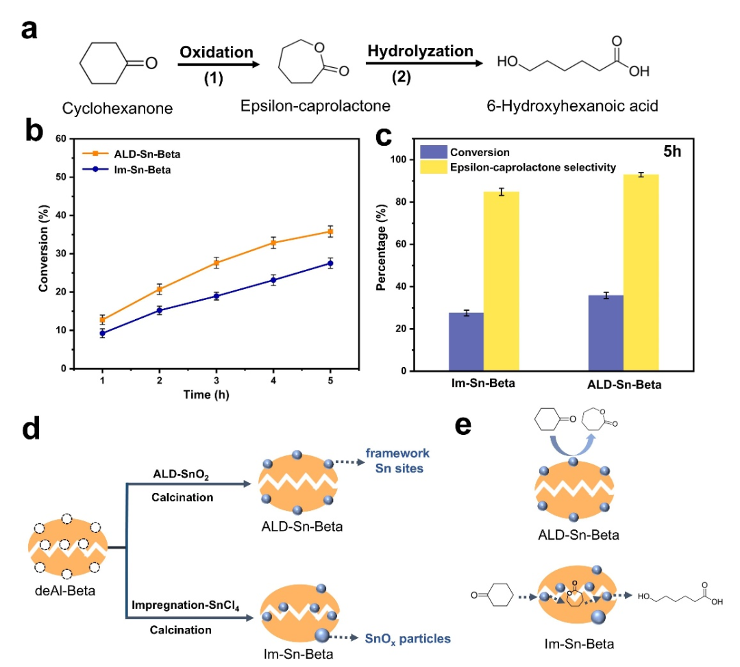 圖2.(a)環己酮B-V氧化反應路線(b)環己酮轉化率隨反應時間的變化(c)催化劑作用5 h后的轉化率和選擇性(d)ALD-Sn-Beta活性和(e)選擇性增強的機理示意圖