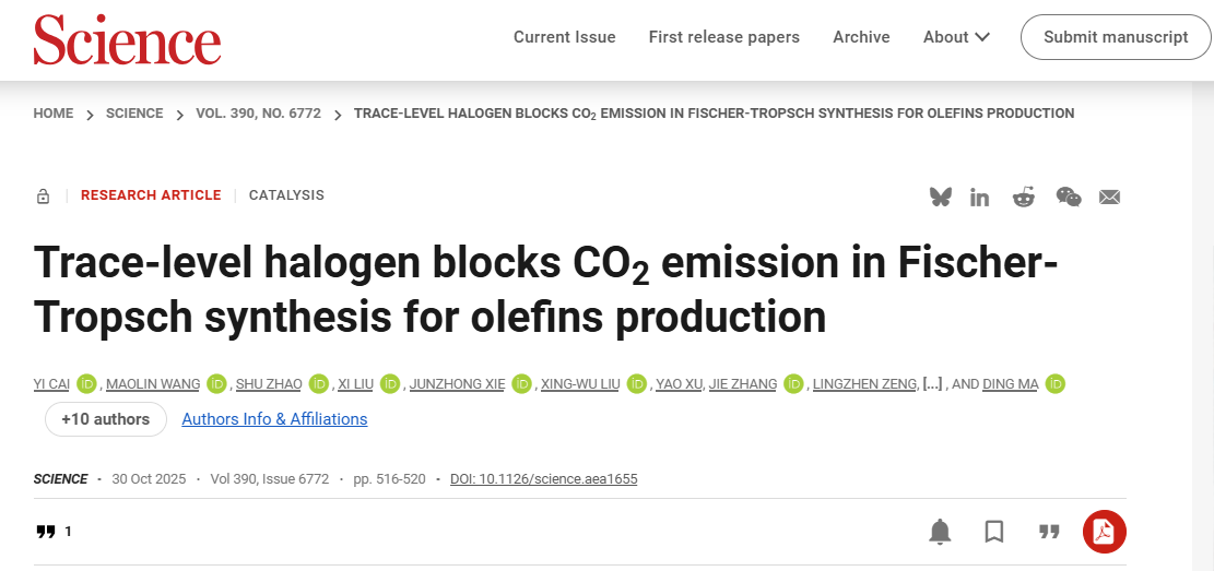 山西煤化所在《Science》發表重大成果:痕量鹵素精準調控費托反應,實現近零CO?排放與高效烯烴生產
